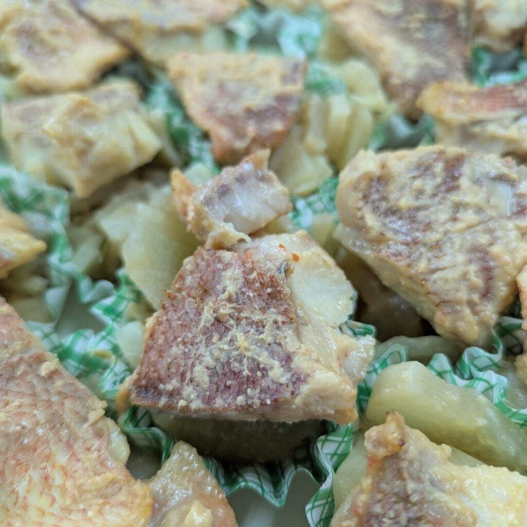 赤魚に白甘味噌を絡めて一晩寝かせて焼いています。赤魚の下にはピリ辛の味噌煮大根が隠れていますよ(。•̀ᴗ-)✧
