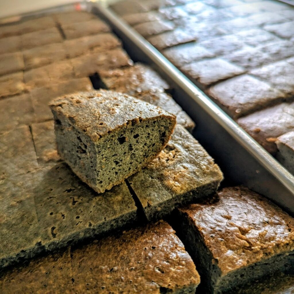 YOME厨房のおからケーキ、今回はゴマペーストを練り込みました。〆にピッタリの幸せデザートです☆