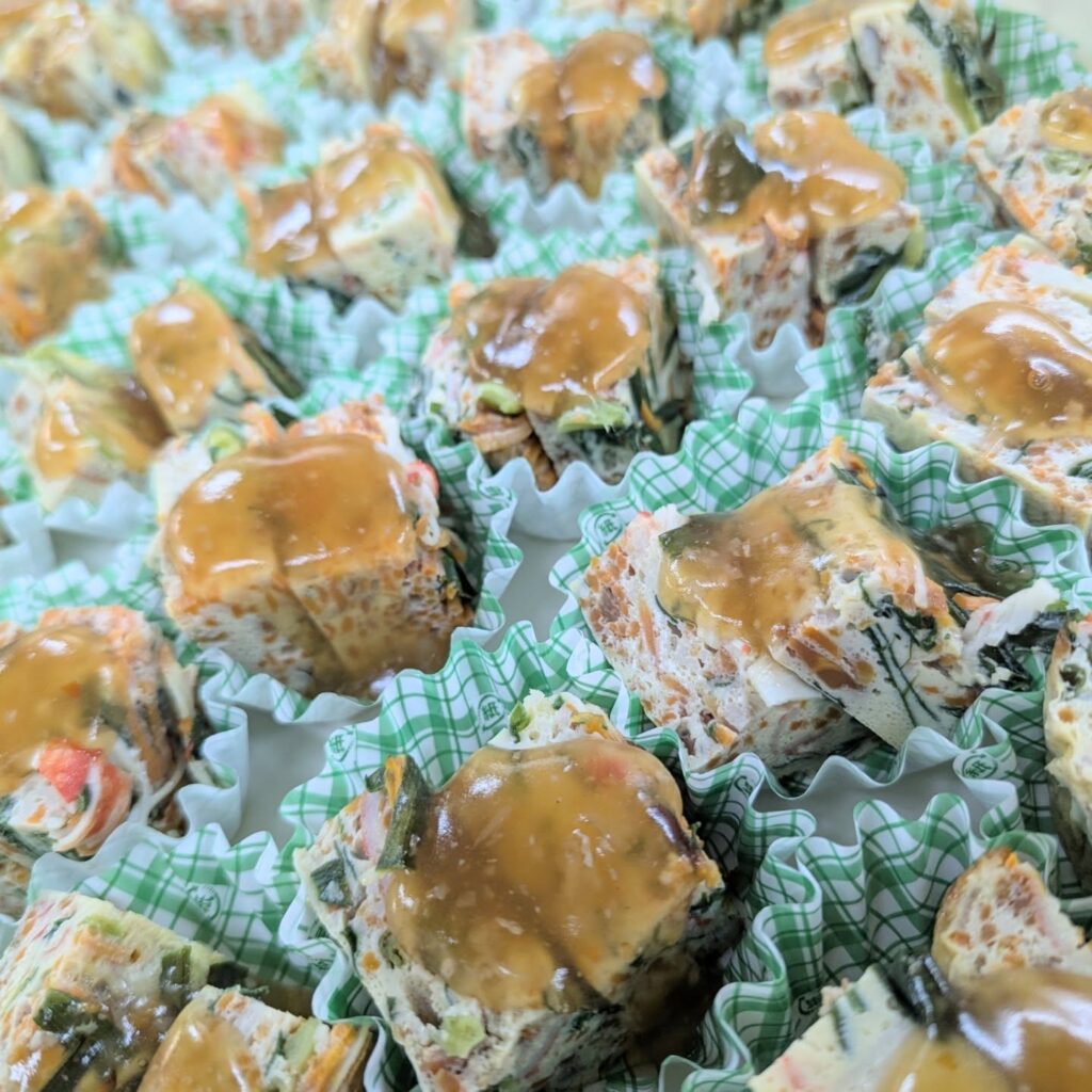 ニラ、干し椎茸、人参、カニかまぼこを混ぜ混んで、具沢山のニラ玉になりました。生姜麹をたっぷり使った一品です。