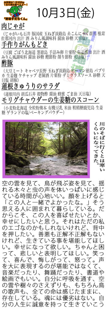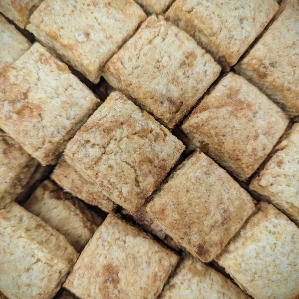 フルーティな生姜糖たっぷりのスコーンです。爽やかな風味をお楽しみください。来週のおすすめは『麻婆茄子』『白身魚天カレーあんかけ』です。お楽しみに。