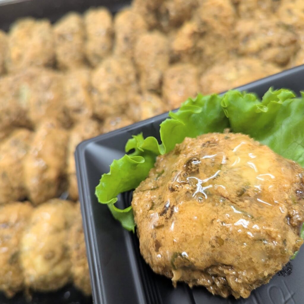 豆腐、ネギ、ごぼうを混ぜ込んで、一つ一つ丸めて揚げました。生姜を効かせたあんをかけて召し上がれ。