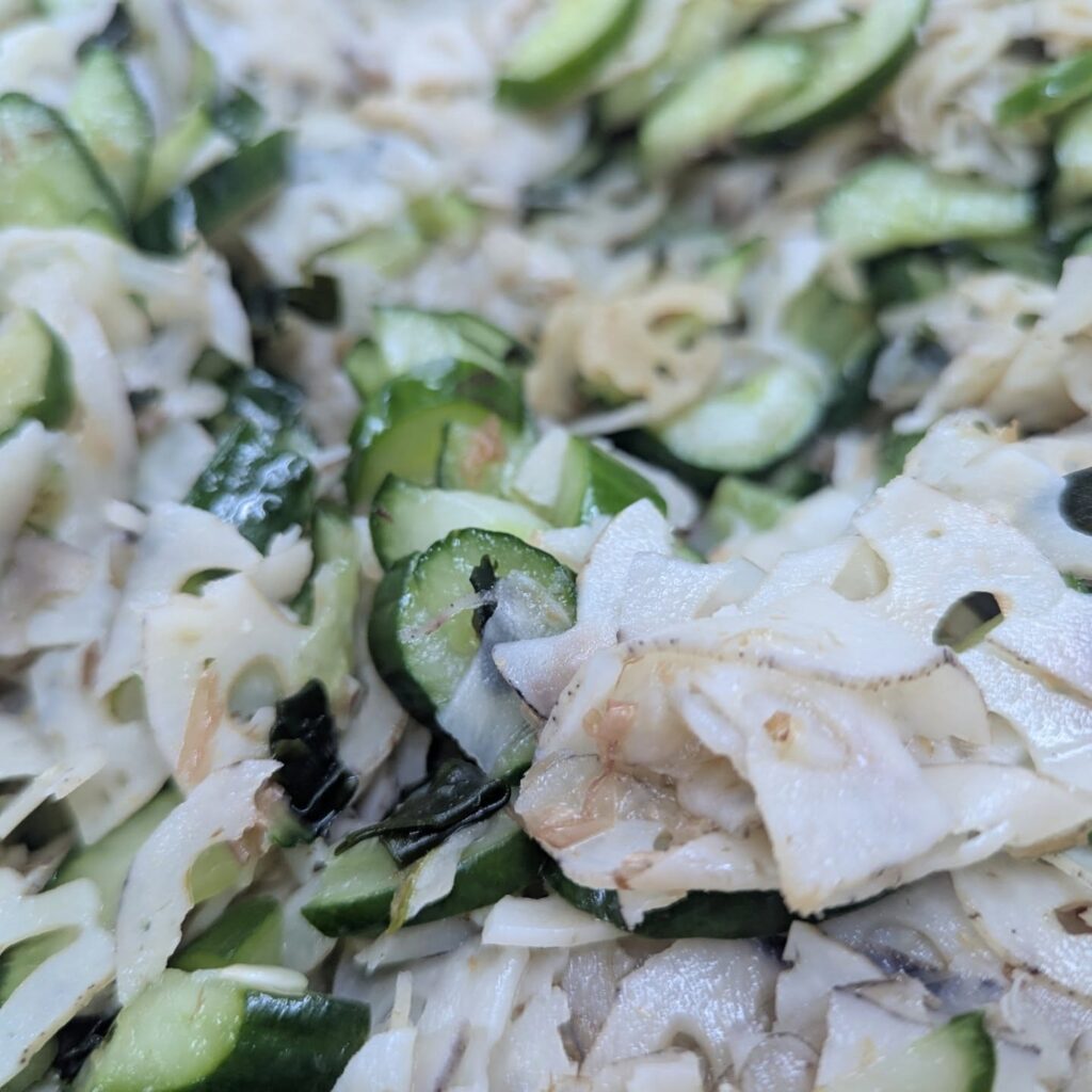 レンコンにワカメ、鰹節をまとわせて、手作りの中華ドレッシングで仕上げました。