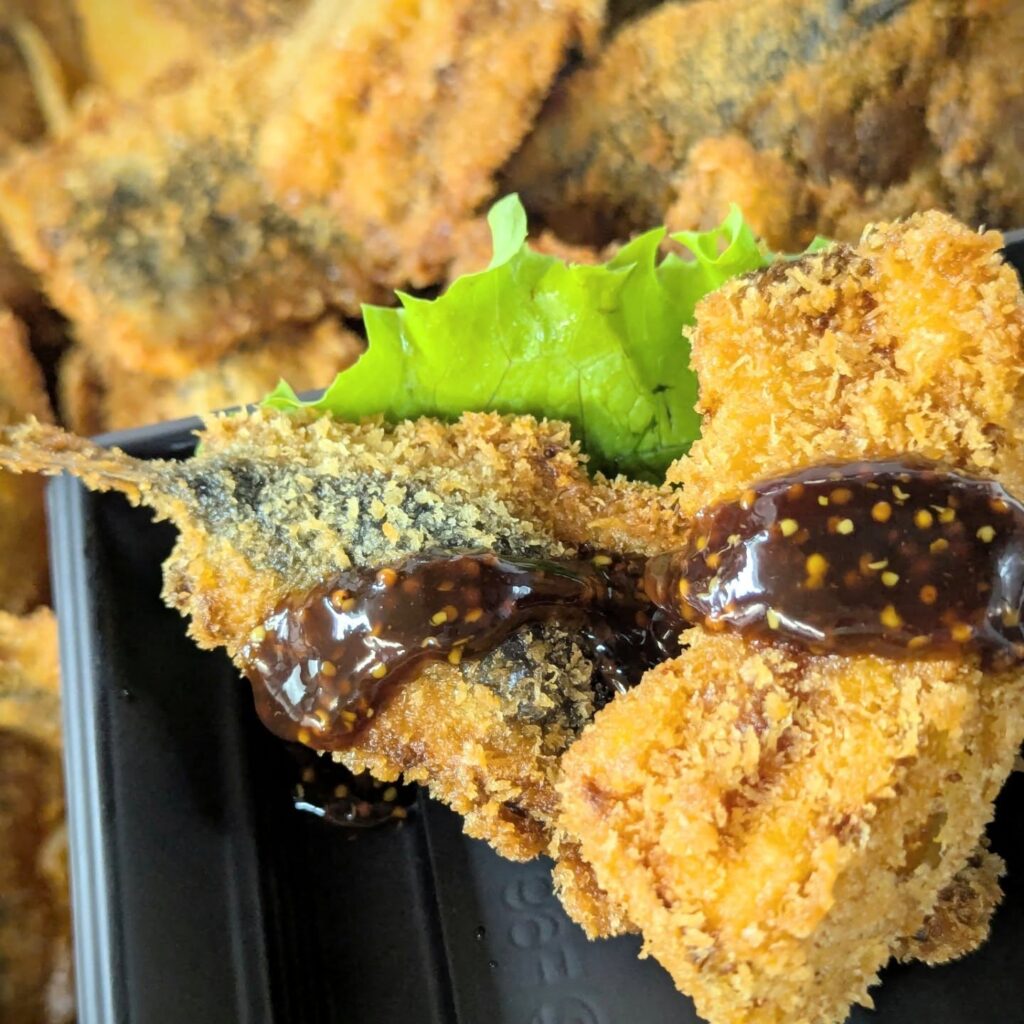 イワシは丁寧に臭みを取り、南瓜とともにパン粉につけました。粒マスソースがクセになります✨