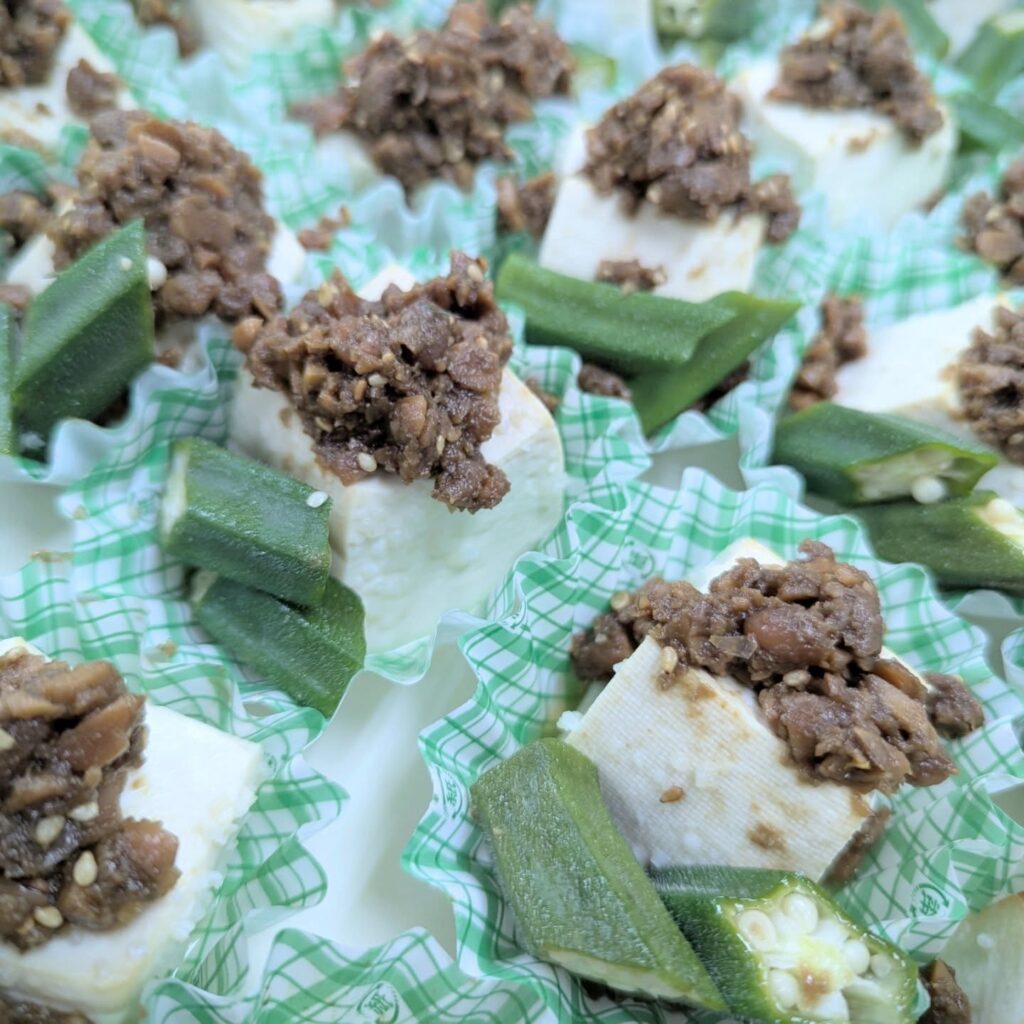 塩麹に塗して一晩寝かせオーブンで焼いた後、手作りのもろみと、緑が綺麗なオクラをトッピング。