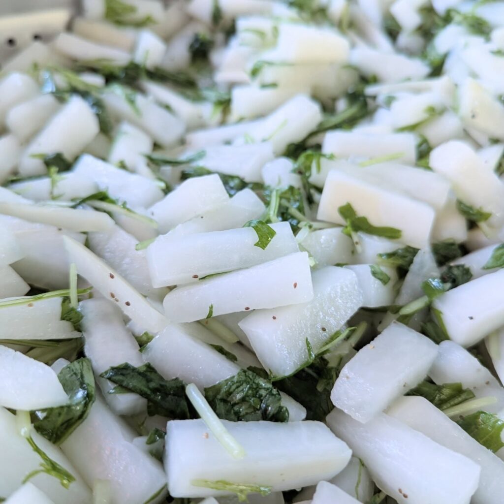 拍子切りした大根と水菜のサラダ。すだち甘酢で爽やかな酸味です。