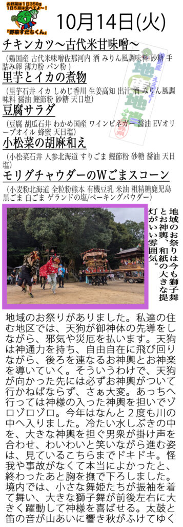 それでは地域の神様にたくさん遊んでもらった私たちの作る今日のお弁当の紹介です。