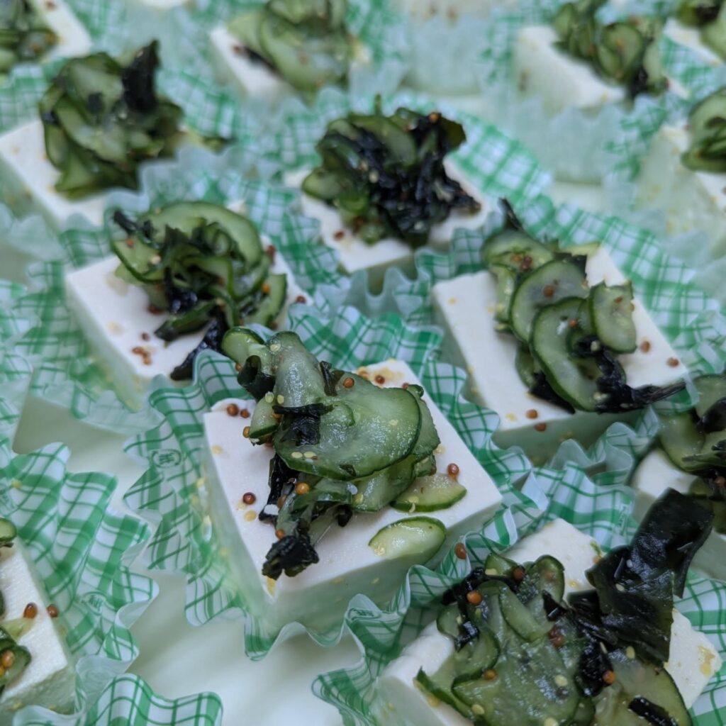 今日はきゅうりとわかめのさっぱりだれを塩麹に一晩つけて焼いたお豆腐にかけています。