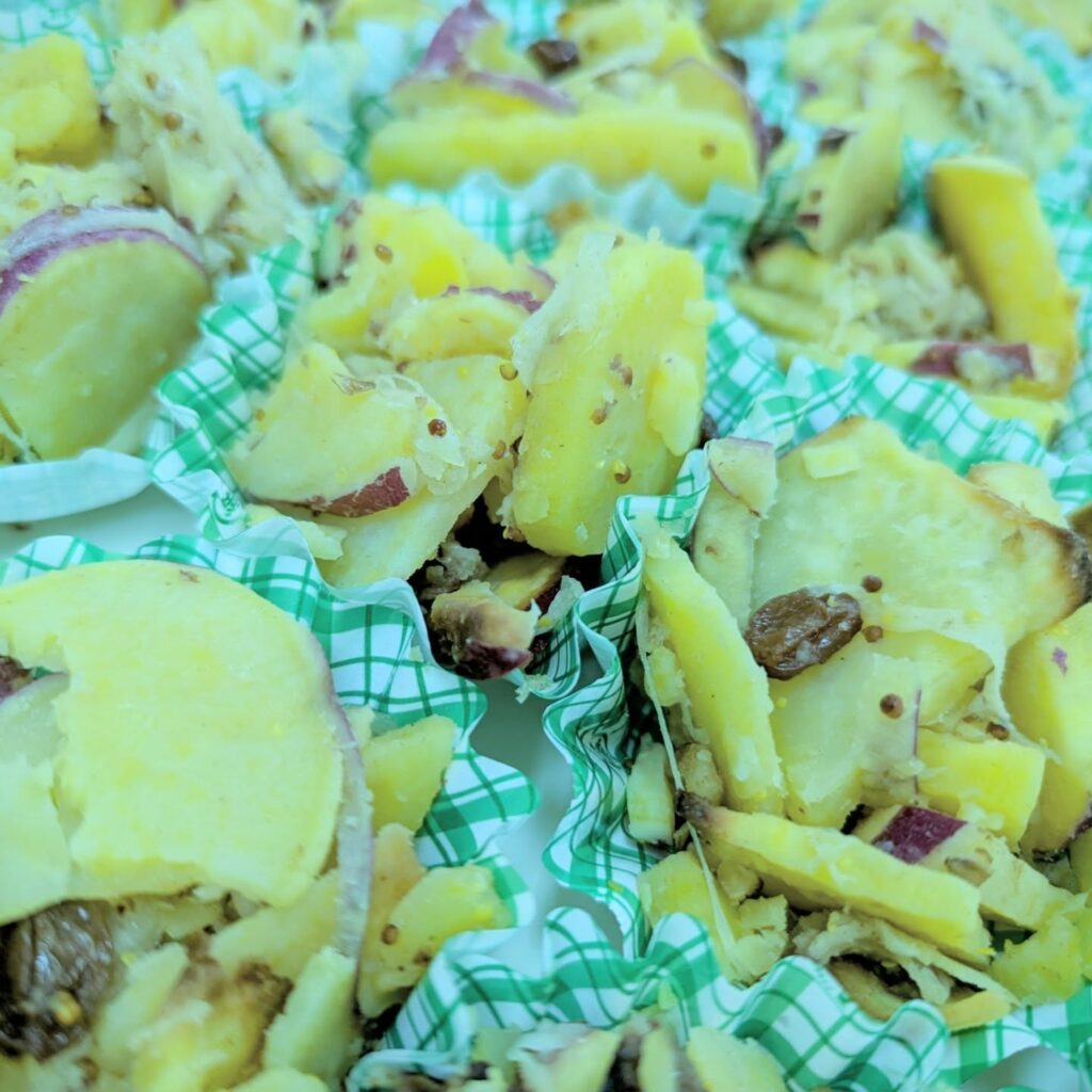 揚げ焼きしたホクホクのさつまいもをハニマスソースで和えました。レーズンの甘みと香ばしく炒ったくるみがアクセントのサラダです。