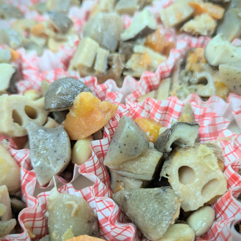 ごぼう、人参、レンコン等の根菜とこんにゃく、大豆をお出汁で煮込みました。ほっとする味に仕上がっています。