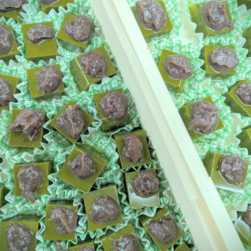 今日のデザートは抹茶寒天です。ほろ苦い抹茶寒天と炊いた小豆もたっぷりの甘〜いあんこと一緒に召し上がれ。