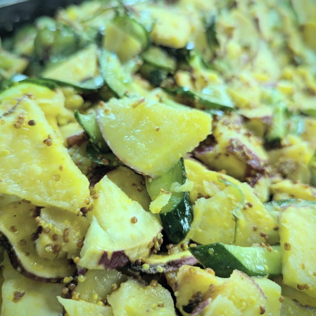 揚げ焼きにしたさつまいもと胡瓜をはちみつ、粒マスタードなどで作った手作りのソースと合わせて作りました。