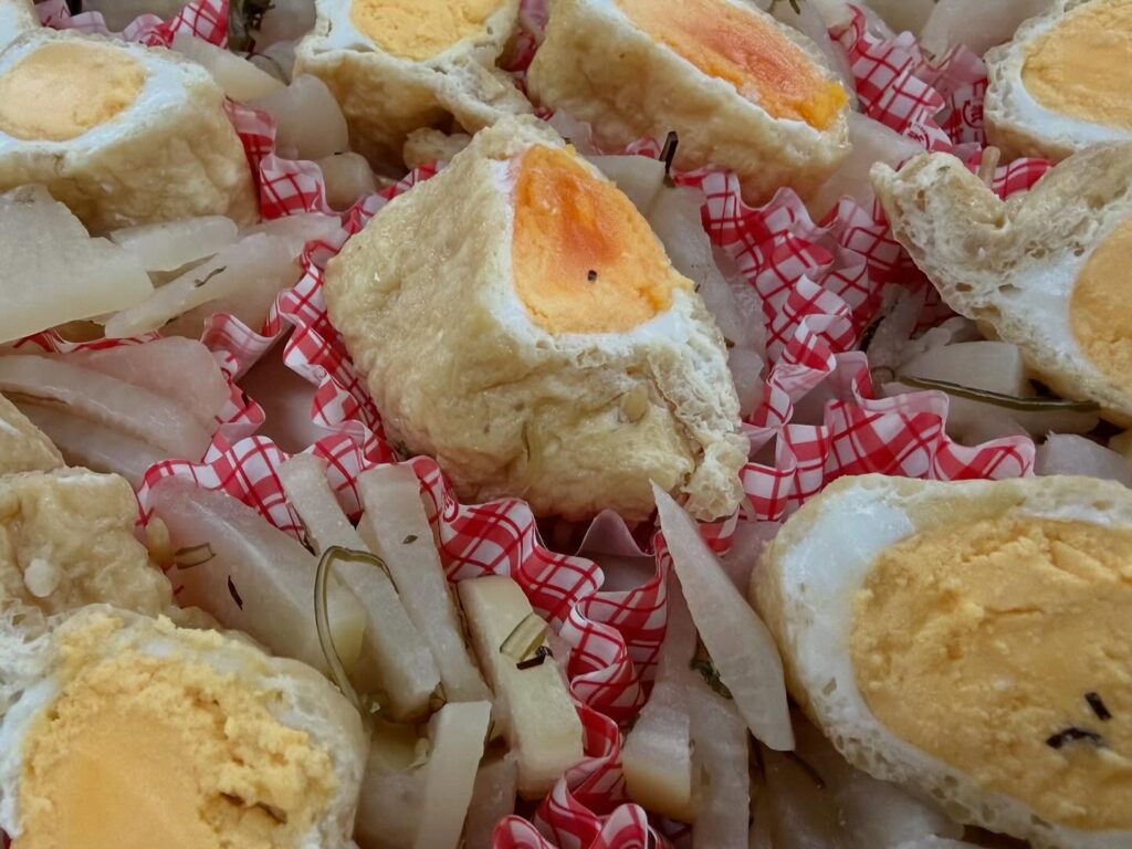 油揚げの端を切り、開いて卵を割り入れ、パスタで口をとじる。ひとつひとつ丁寧に作りました。