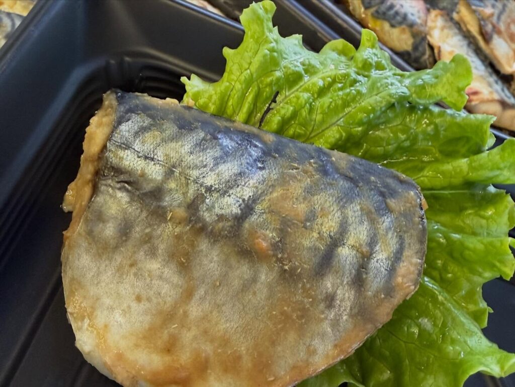 鯖に、からしを混ぜた白甘みそをまぶして焼きました。味噌が染みてやさしいお味になっています。