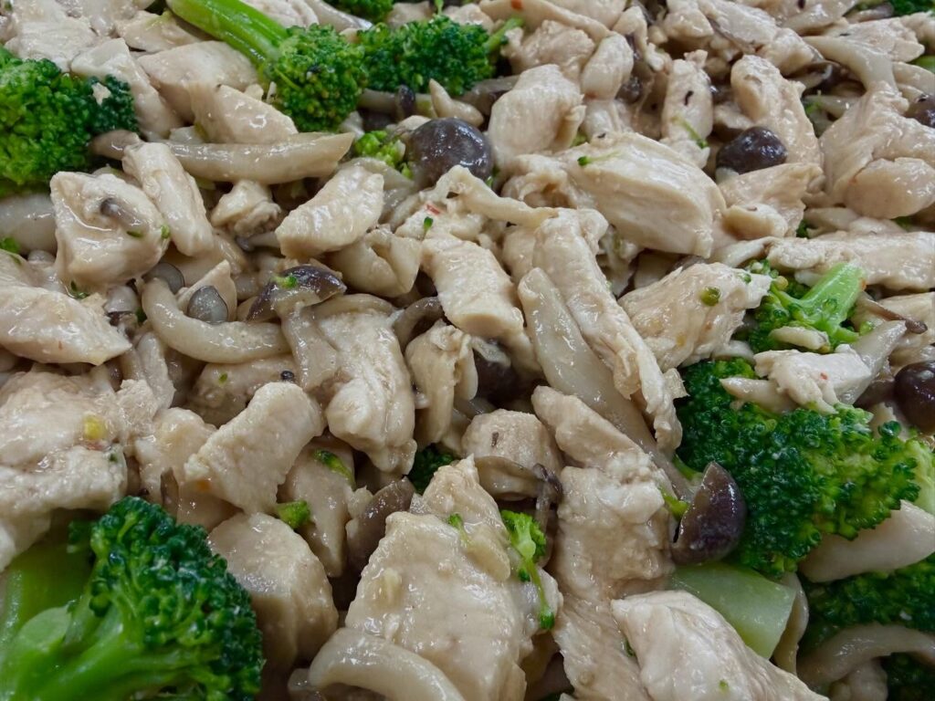 ふんわりと蒸した鶏肉は、生姜のきいた手作りバンバンダレで味付けしました。今回は、ブロッコリー、しめじも一緒に。
