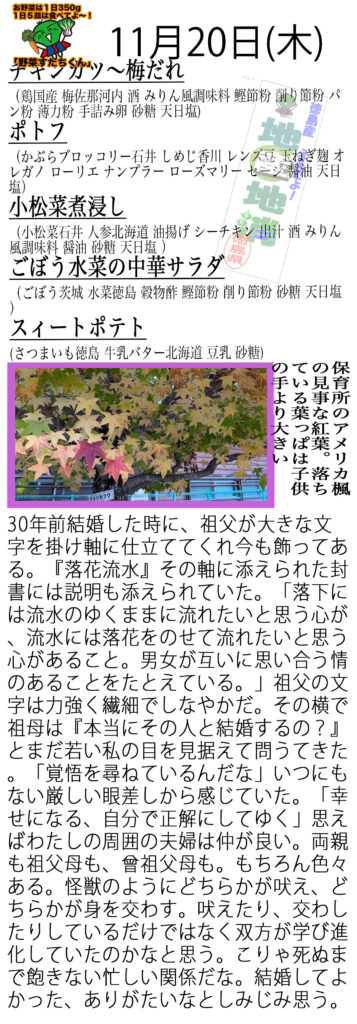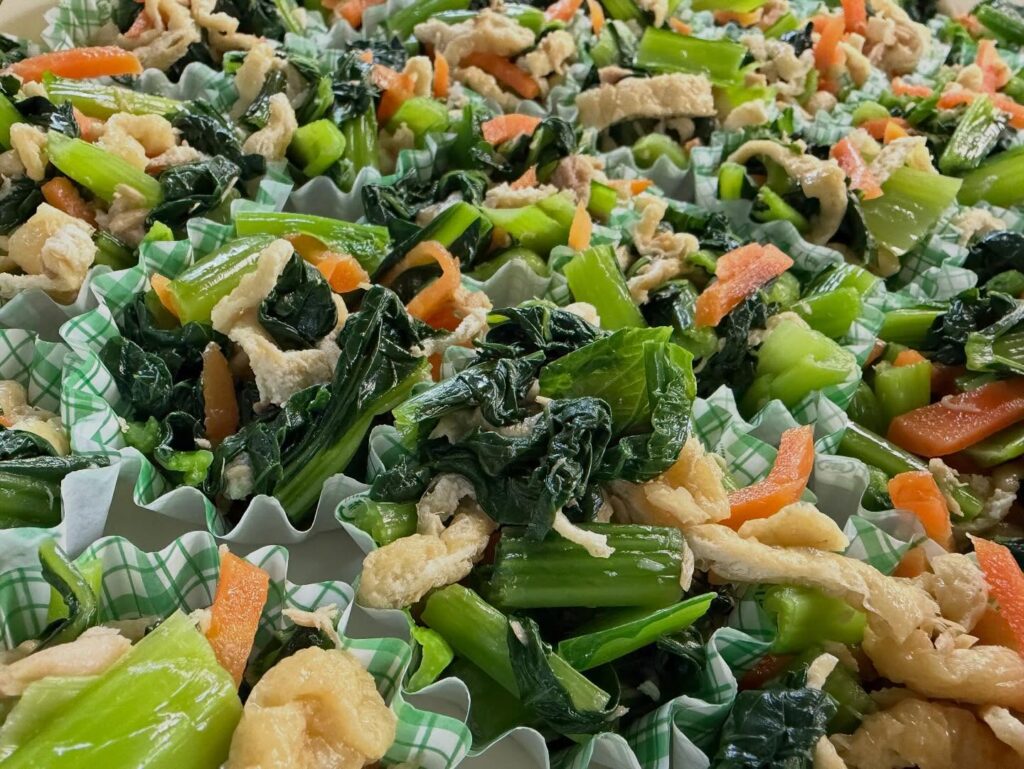 小松菜、人参、油揚げ、シーチキンが入った煮浸しです。優しいほっこりしたお味です。