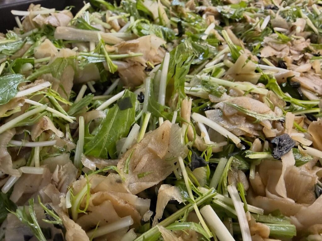 さっぱりと特製中華ドレッシングで和えた、ごぼうと水菜、わかめのサラダです。