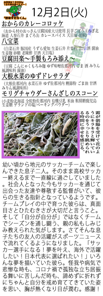それでは明日のおすすめメニューは、「鶏ひき肉の巾着煮」「胡麻豆腐」です!お楽しみに〜!