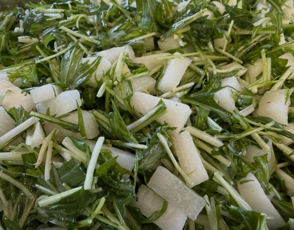 拍子切りした大根と水菜のサラダ。すだち甘酢で爽やかな酸味です。