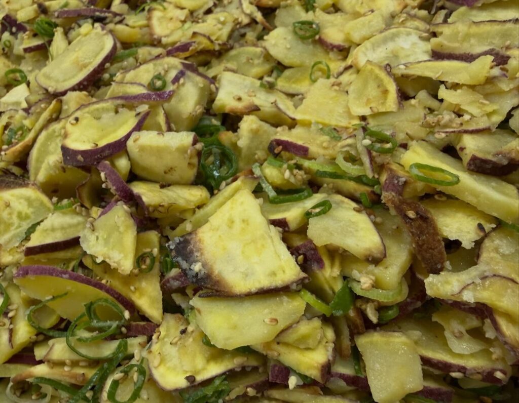 さつまいもを揚げ焼きしてから、なっちゃんお手製のネギバターしょうゆで味付けしてます!