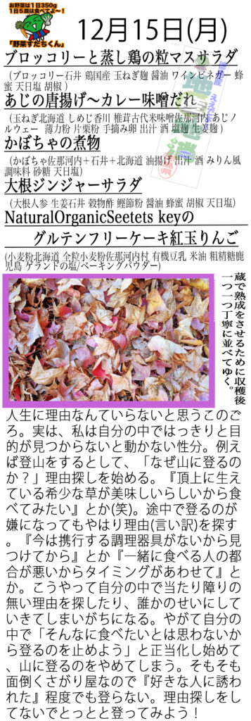 これが朝一番の私の仕事。家のすぐ横に職場?というか、日々の全てがお弁当作りなのでわたしのなかでは、どれが仕事なのかもはや判らない感じです。