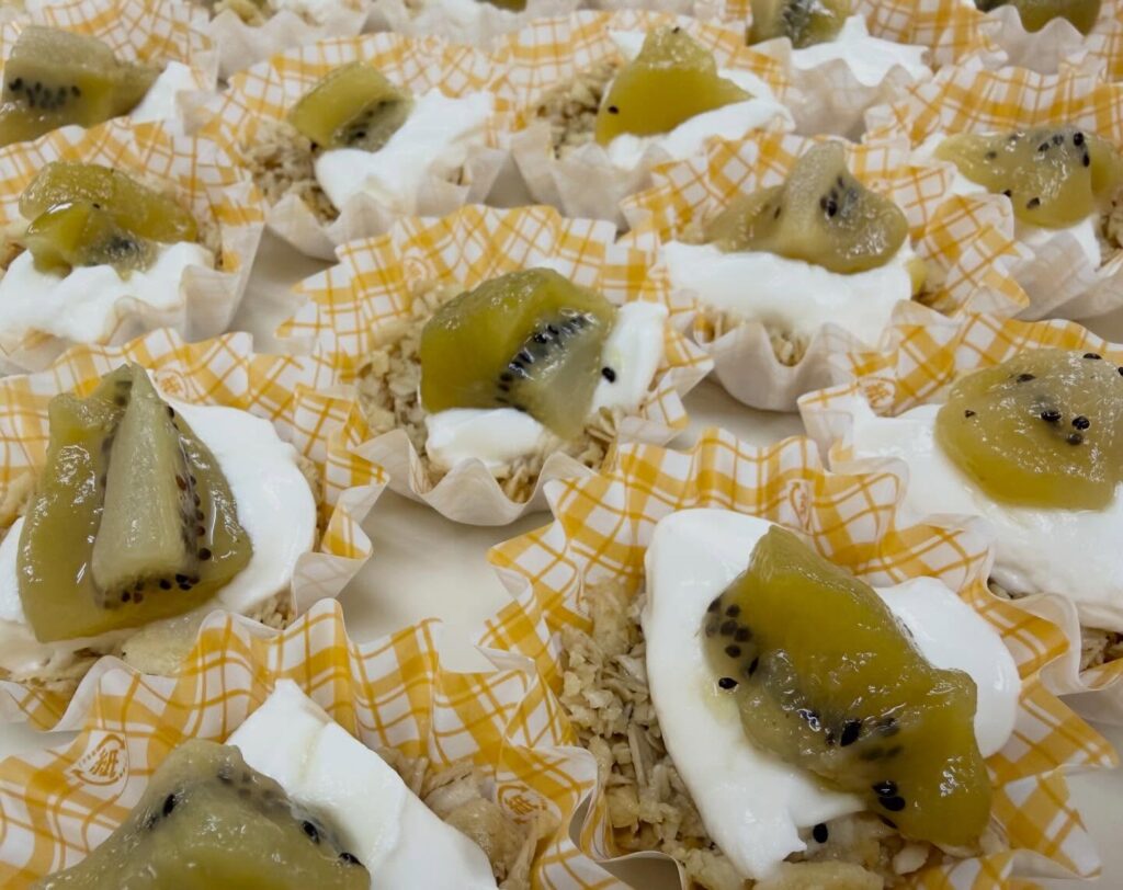 オートミールとクラッカーを砕いて作った蜂蜜とバター香る生地の上に水切りヨーグルトとキウイコンポートをのせました。水切りヨーグルトの濃厚さと、キウイの甘ずっぱさが最高の組み合わせです。
