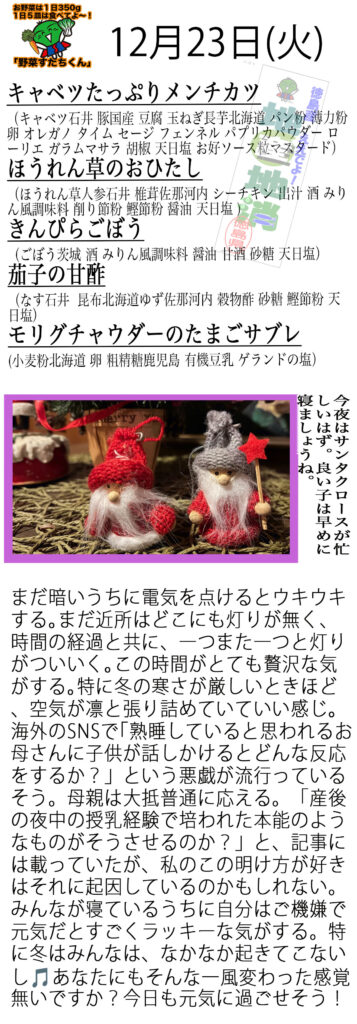 きまえちゃんとこだわっている所が反対なのがおもしろかったです。今はまだ真っ白なカレンダー、楽しい予定をたくさん書き込める一年になるといいな。それでは今日のメニューの紹介です。
