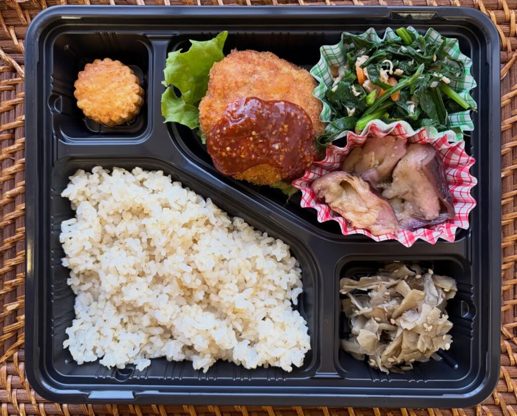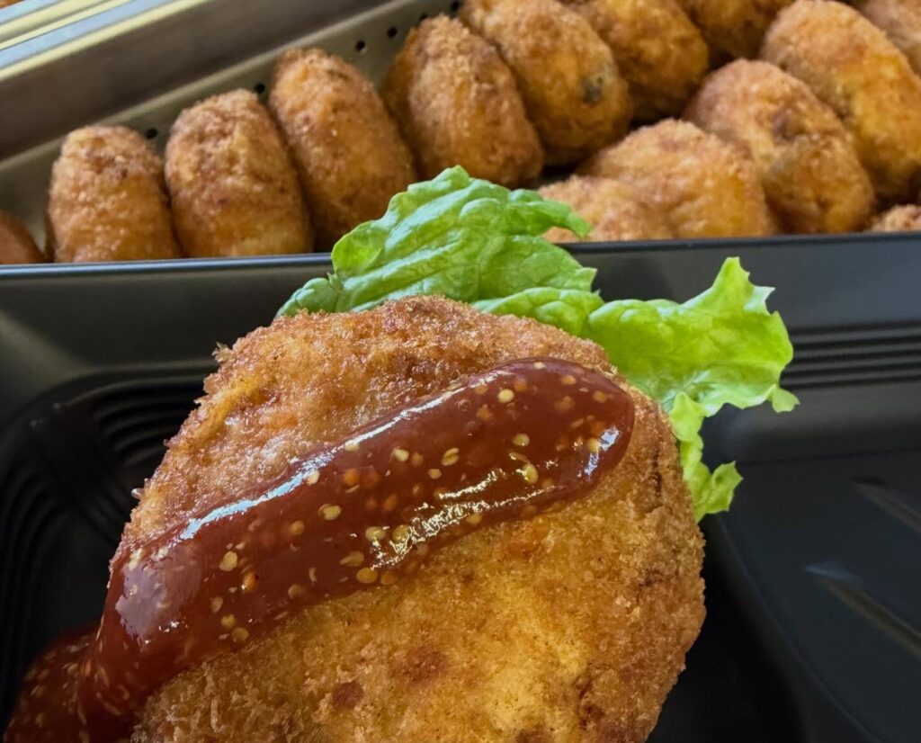 た〜ぷりのキャベツと玉ねぎ、豚ミンチでタネを作り、朝にサクッと揚げたメンチカツです。たくさんキャベツが入ってるので美味しく柔らかくなっています。粒マスケチャソースでお召し上がり下さい。
