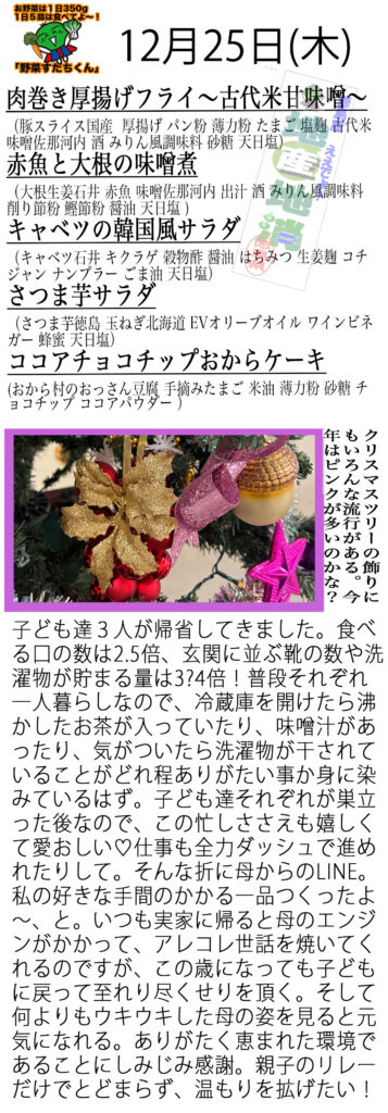 さて、クリスマスが終わるといよいよ年末。今年のラストスパート。美味しいご飯を食べて走り抜きましょー!今日のメニューの紹介は、たかおさんが書いてくれました。