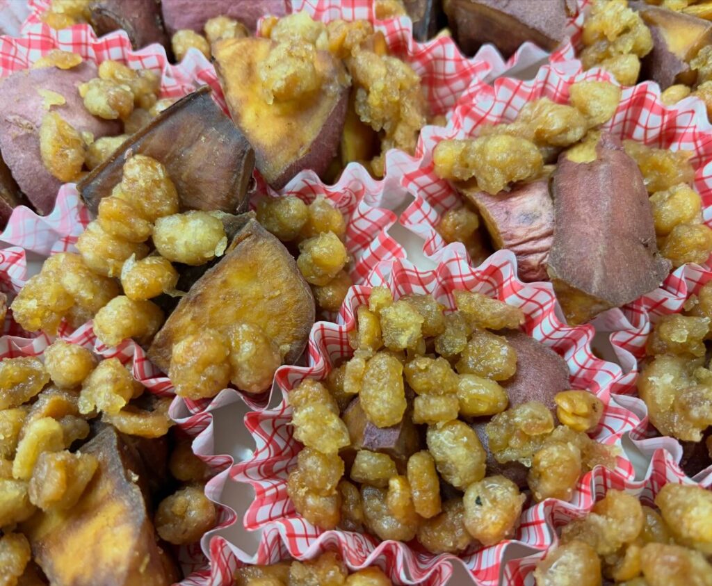 大豆と素揚げしたさつまいもを甘辛タレをまぶして大学芋のような甘さに。さつまいもも美味しいですが、これは大豆が好き!という人も。
