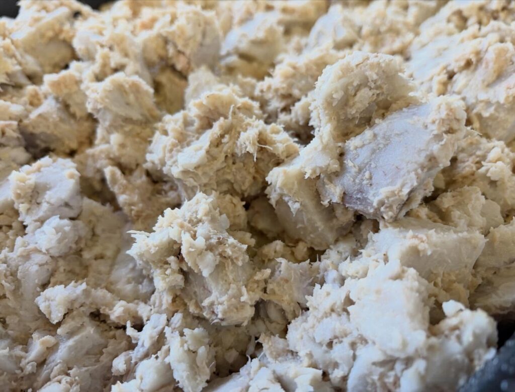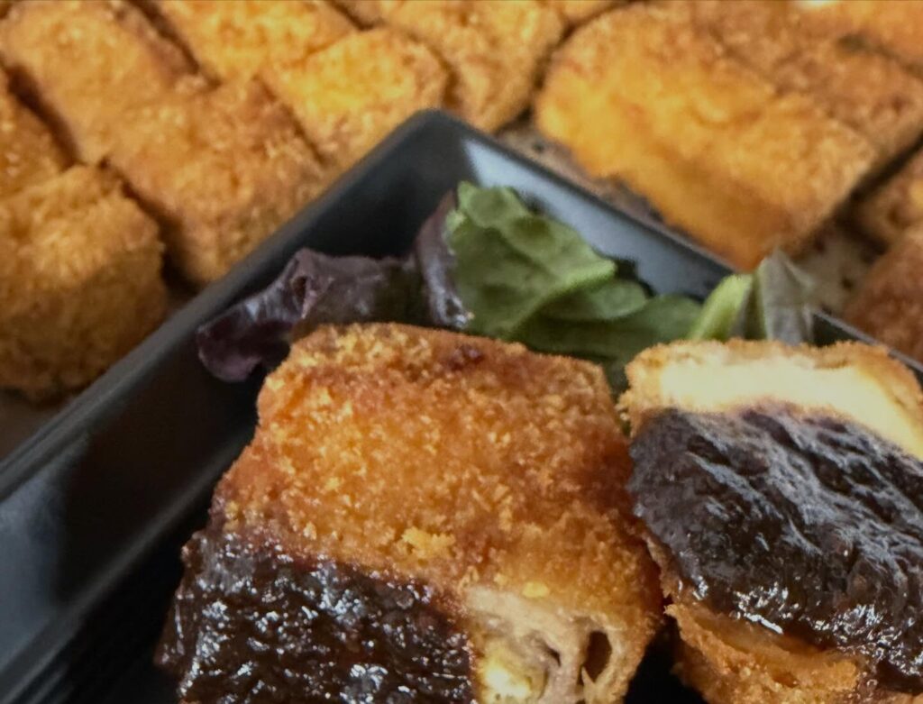 ひと晩塩麹に浸した厚揚げを、一つ一つ丁寧に豚肉で巻いてフライにしました。古代米味噌タレでどうぞ。