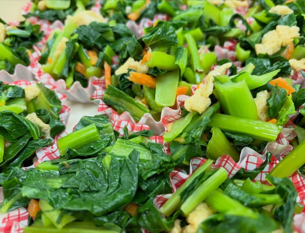 小松菜にしいたけや油揚げのお出汁が染みて、食べるたびじゅわわ〜〜っとおいしさがひろがります。人参も添えて彩り良く仕上がりました。