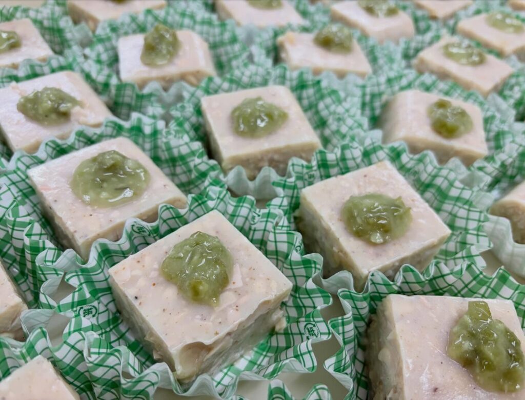 粗みじんにした大豆を、アガーと出汁の旨味でギュッと固めた手作り豆腐です。トッピングの茎わさびがピリリと効いています。