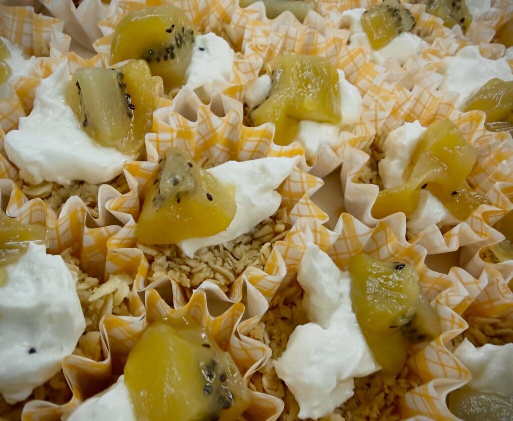 オートミールとクラッカーを砕いて作ったサクサク生地の上、水切りヨーグルトとキウイジャムをのせました。水切りヨーグルトの濃厚さと、キウイの甘さが最高の組み合わせです。