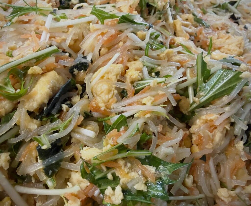 水菜、人参、炒り卵、わかめを使って手作り中華ドレで和えました。春雨でさっぱりとした箸休めです。