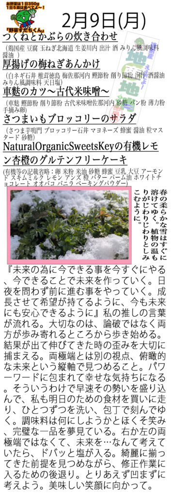 おはようございます。YOME厨房のなつかです。昨日はたくさんの雪が舞いびっくりでしたね。ちょうど選挙の熱も合わさって、社会の激動をうつすような気持ちになりました。