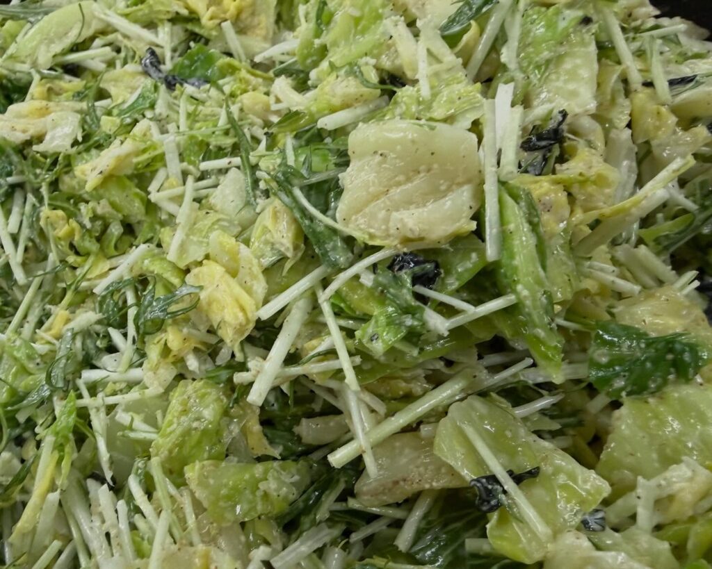 サッと茹でたキャベツと、シャキシャキ食感の水菜をコクのあるゴママヨで和えました。