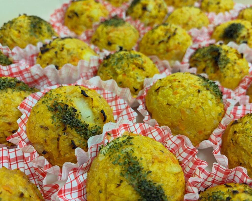 ほくほくの新じゃがいもをマッシュして、スパイシーなカレー味で調味して丸め、オープンでこんがりと焼き上げました。もちっとしていて食べ応え抜群です。