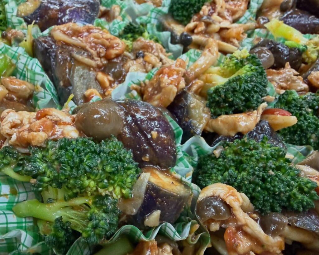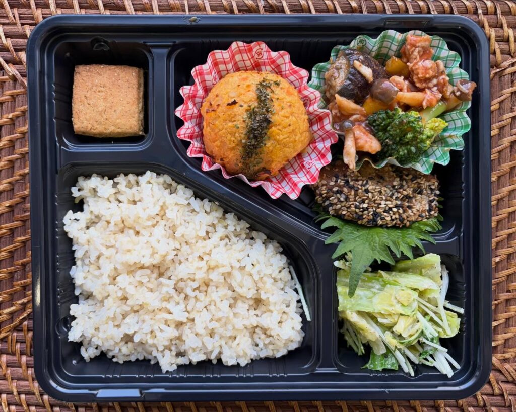 揚げ焼きにした茄子と、ブロッコリー、豚肉、しめじが入ったラタトゥイユです。旨みの詰まった手作りのトマトソースで煮込みました。