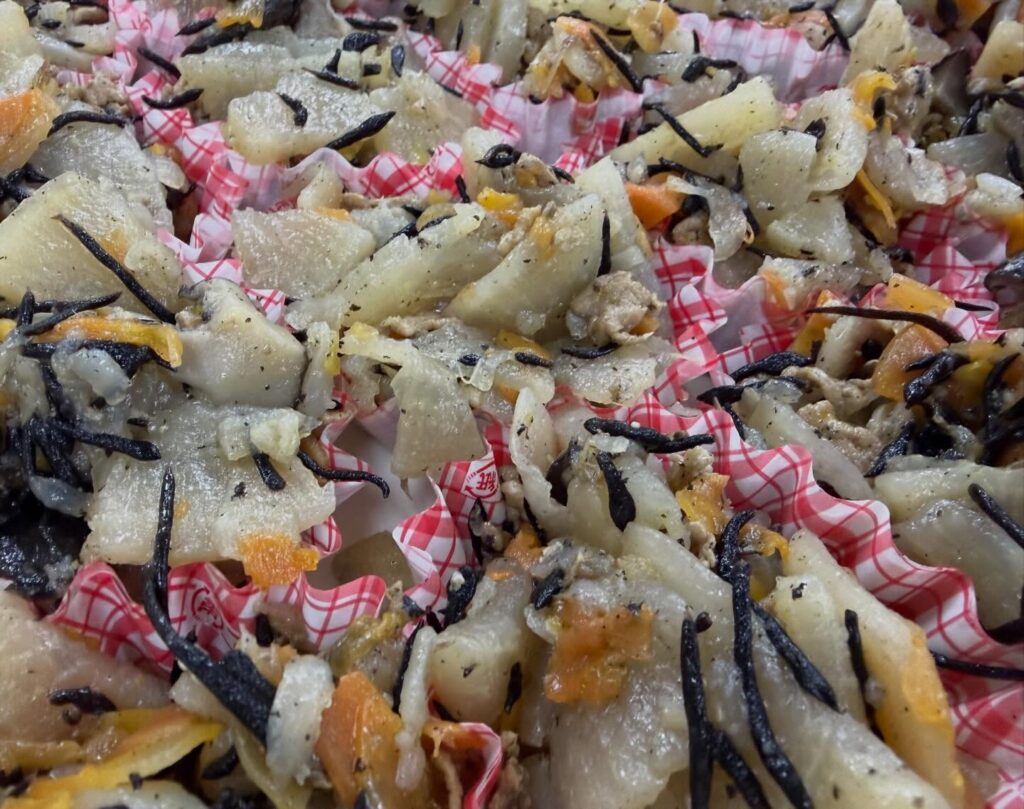豚肉と大根、ひじき、椎茸を煮物に。それぞれの素材から旨みが出て優しいお味に仕上がってます。