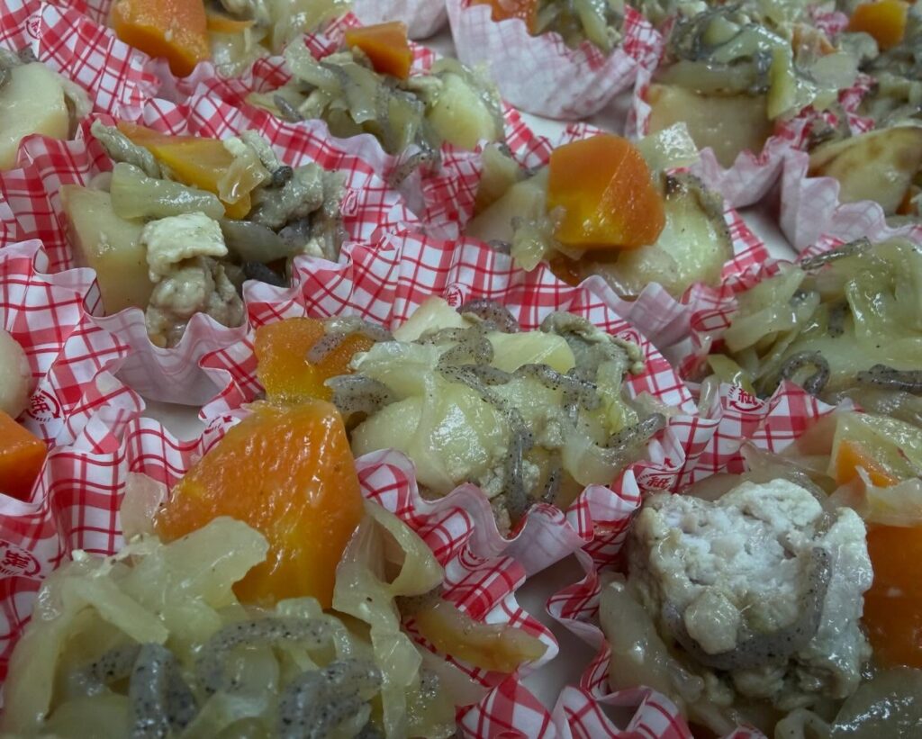 肉の旨味たっぷり染み込んだじゃがいもに玉ねぎ、人参、糸蒟蒻を濃い目の味付けでご飯が進みます。