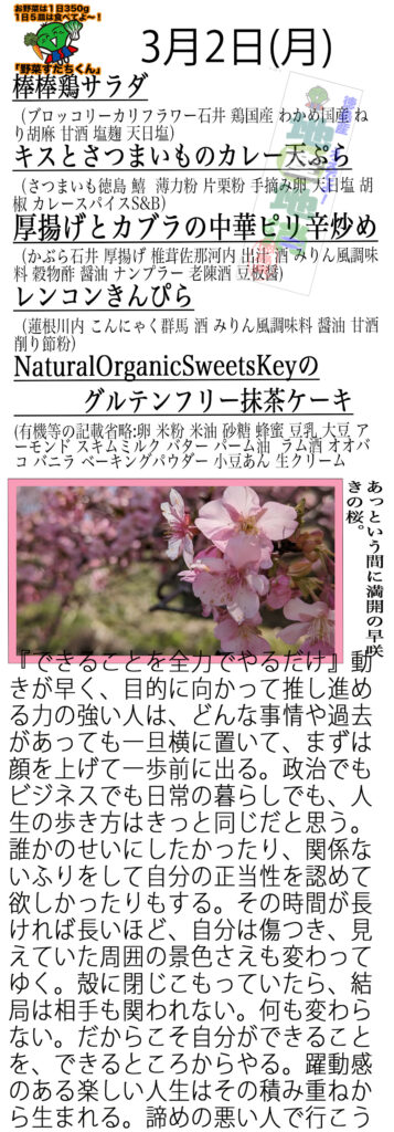 3月の最初の月曜日ですね。昨日は高校の卒業式があったようで、徳島市内は花束を抱えた最後の制服姿の子達ををたくさん見かけました。そして、近所の早咲きの桜も満開です。あたりがピンクになってどこかウキウキします。