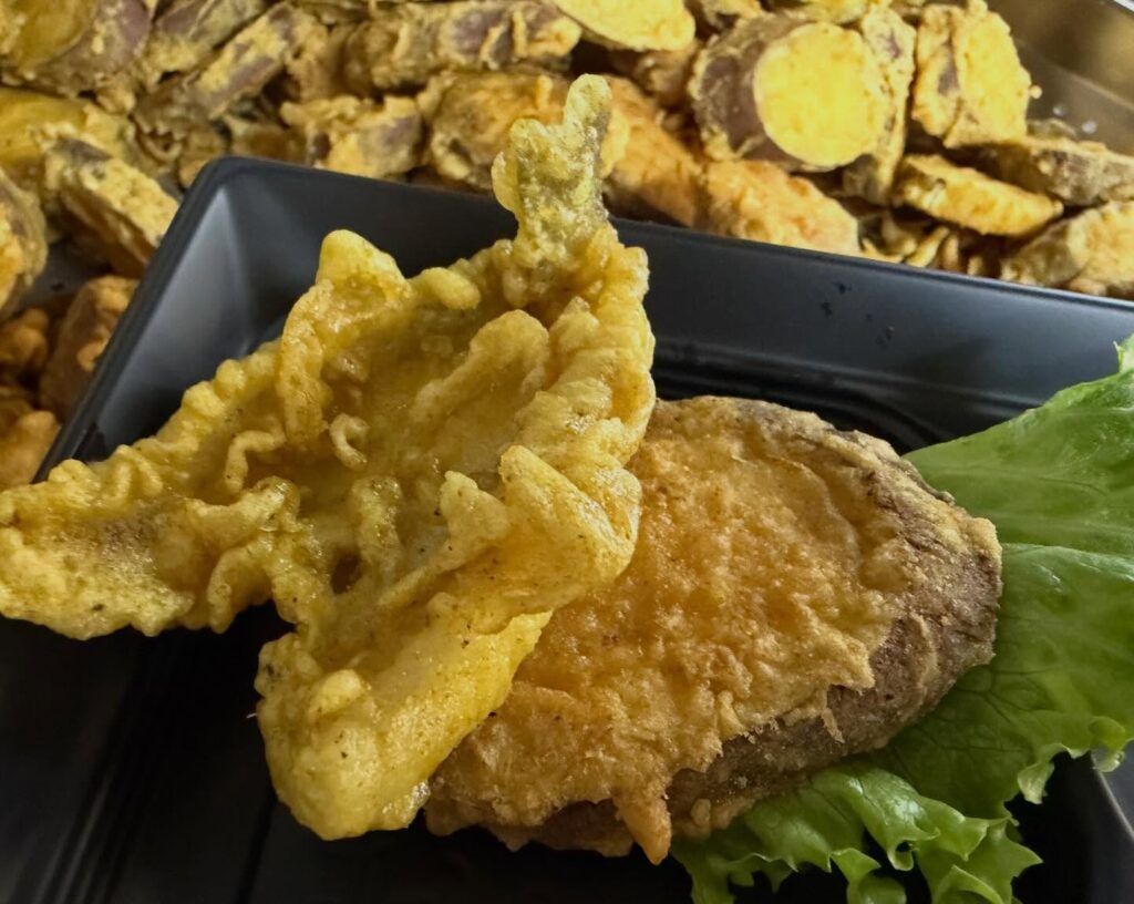 今日の天ぷらは、カレースパイスを入れて、白身の魚のキスとサツマイモの天ぷらです。