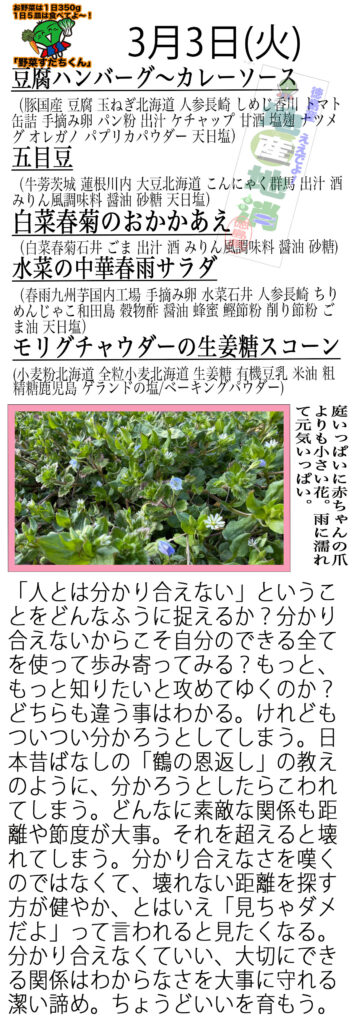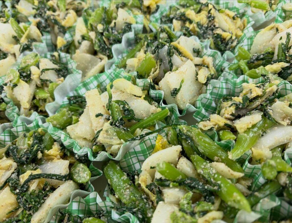 今日は白菜と春菊です。生の春菊を食べた菜津佳さんが、この春菊美味しい〜とニコニコしてました。練りごまも入ったコクのある白和えとのハーモニーをお楽しみください。