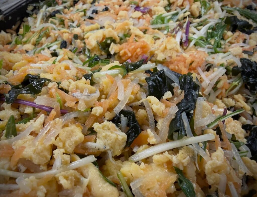 水菜、人参、炒り卵、わかめを使って手作り中華ドレで和えました。その上に、いりいりしたちりめんじゃこをトッピング。今日は紫の水菜も入って可愛いです。