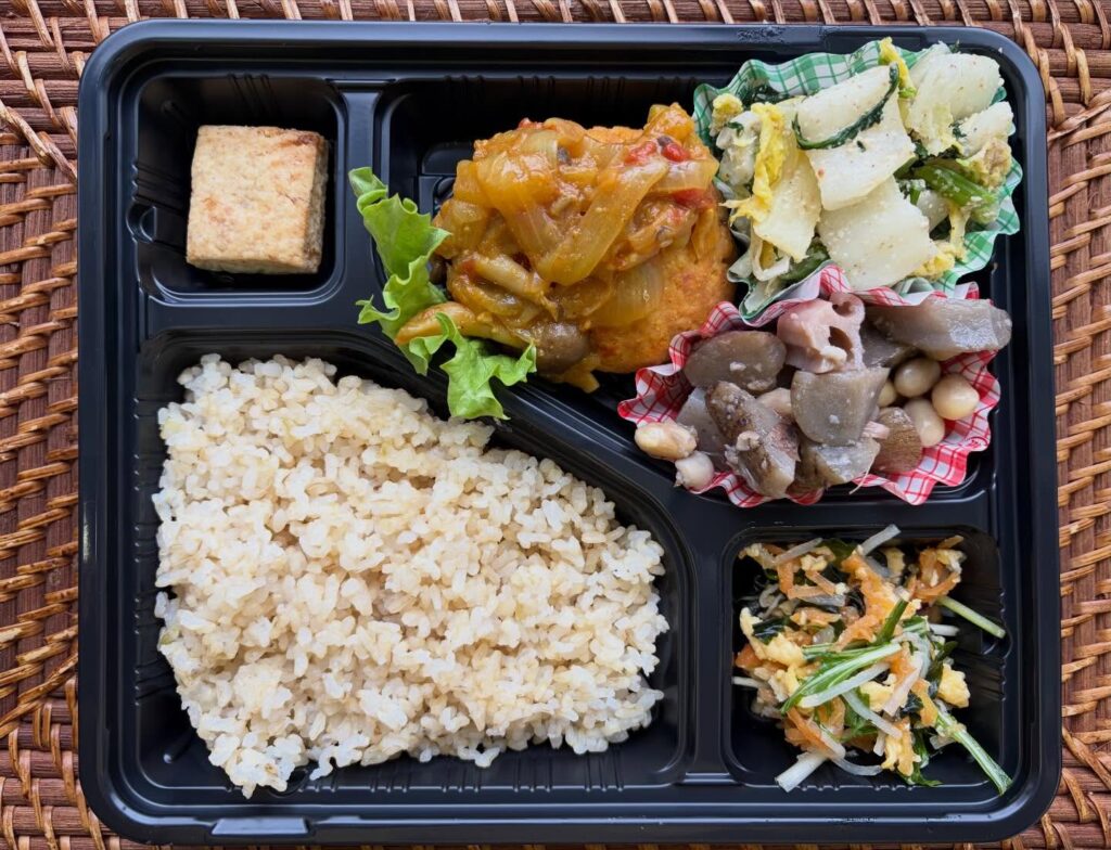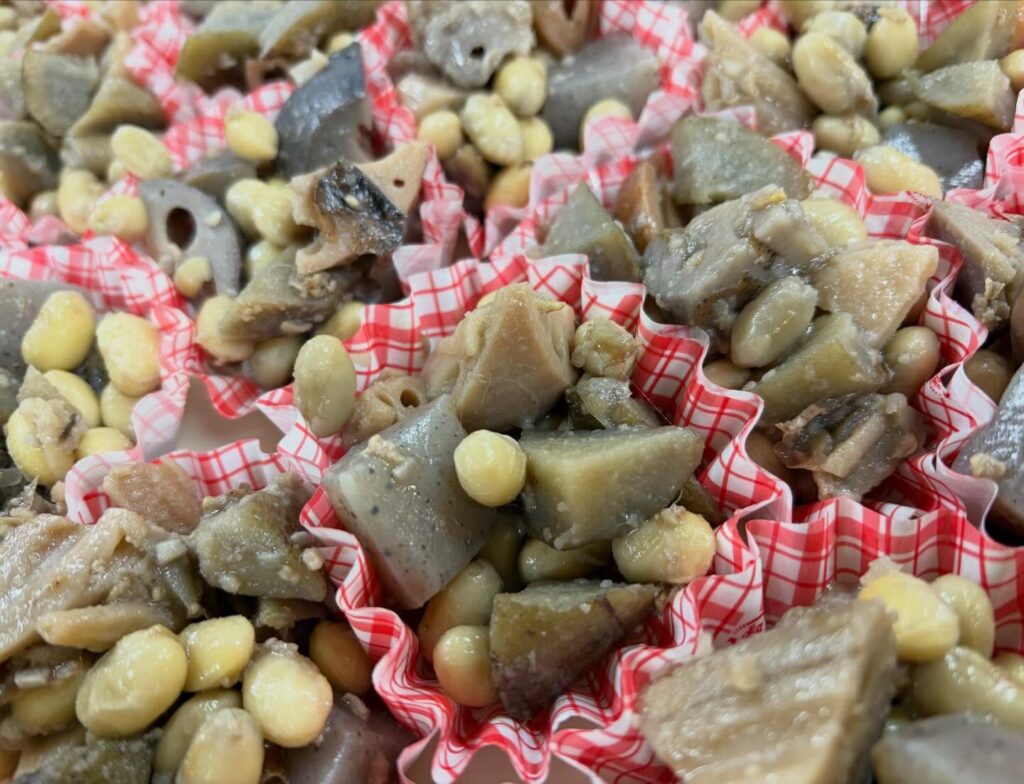 ふっくら炊いた大豆に、たっぷりの根菜とこんにゃくを合わせた五目豆です。味が染みるようじっくりコトコト煮込みました。
