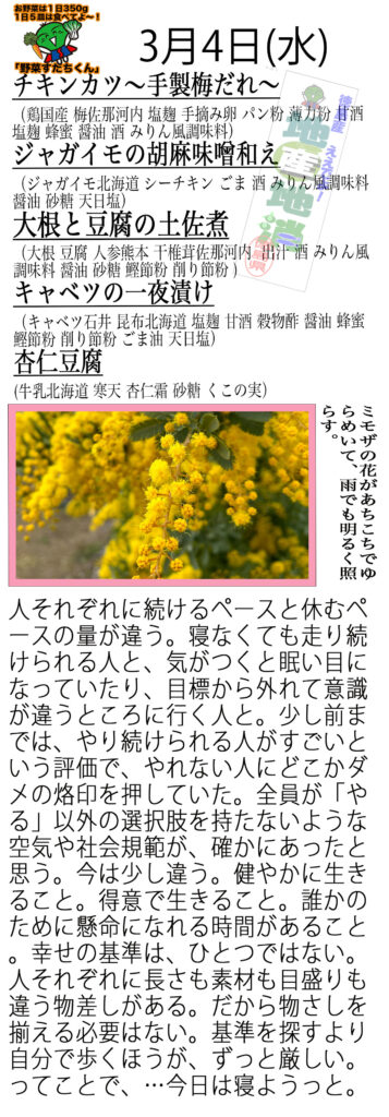 今は梅が満開で、ミモザも咲き始めていて、これからどんどん色々な花が咲き動き出す季節。やっぱりワクワクと楽しい気持ちになります。春のパワーを吸い込んで、足どり軽く今日も頑張っていきますよ!