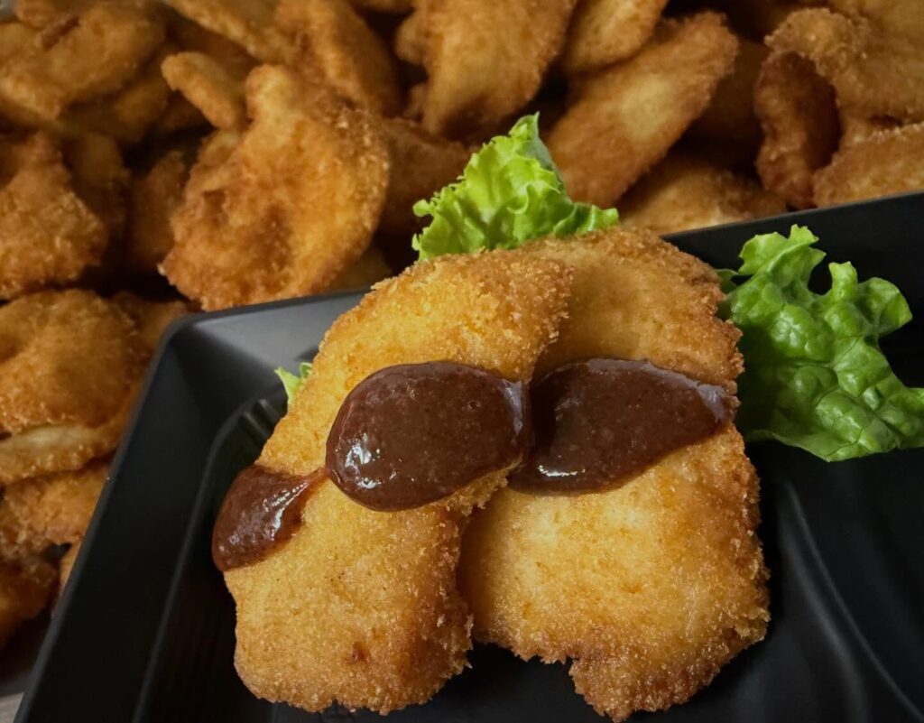 朝からカラッと揚げたチキンカツ。今日は梅ダレでお召しあがりください。梅ダレは、佐那河内の梅を使った手作りです。