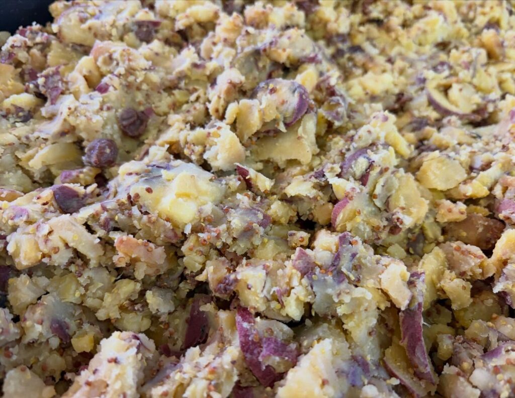 ほっくりスチームしたさつまいもを、特製ハニマスソースで和えました。蜂蜜、粒マスタード、醤油のバランスが絶妙です。