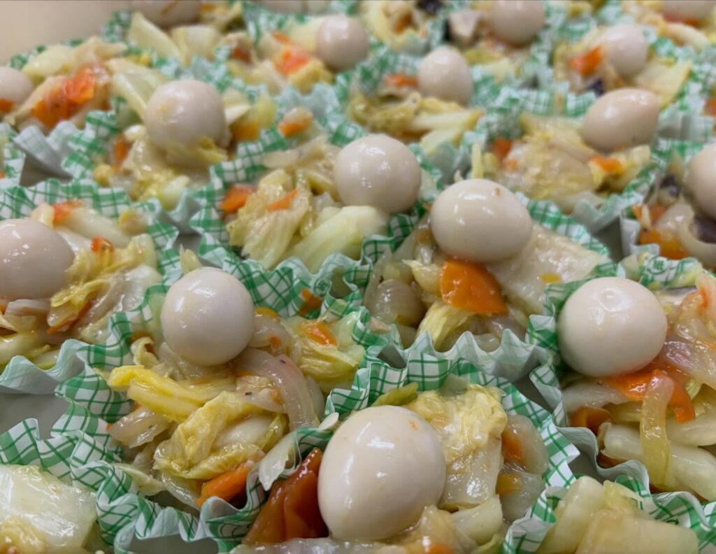 一つ一つ手作りのしゅうまいは、豆腐も入ってふわっとヘルシー。人参でいろどりも可愛くなりました。一度蒸してから再び焼いて出来上がり!