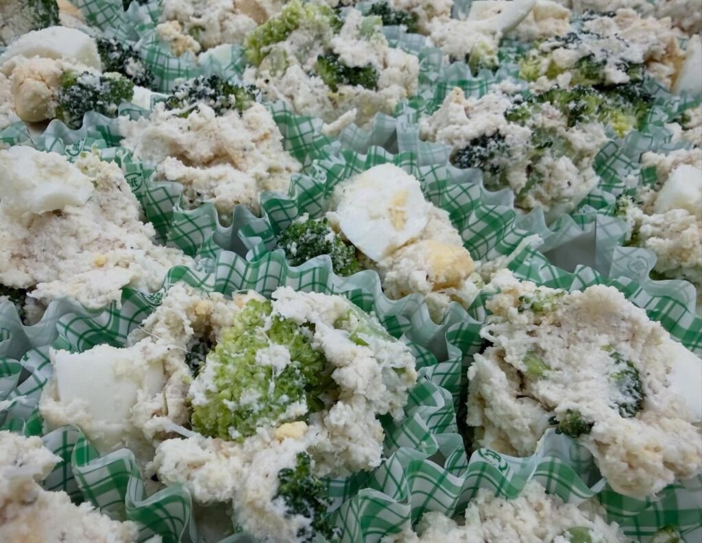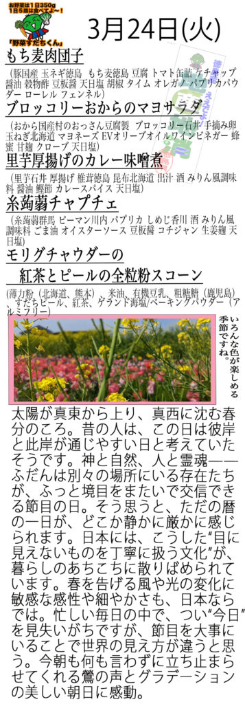 おから、ブロッコリー、ゆでたまご、シーチキンが入ったマヨサラダ風です。実はほとんどマヨネーズが入ってなくて、この時期お困りの方が多い花粉症対策にクローブなどのスパイス、ハーブがたくさん入っています。